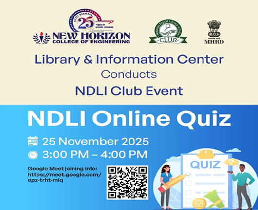 New Horizon College of Engineering and NDLI Club in association with the National Digital Library of India conducted NDLI Resource Spotlight on 20.06.2025. The event was attended by 137 Participants from New Horizon College of Engineering. National Digital Library of India (NDLI) is a virtual repository of learning resources, which is not just a repository with search/browse facilities but provides a host of services for the learners’ community. It is sponsored and mentored by the Ministry of Education, Government of India, through its National Mission on Education through Information and Communication Technology (NMEICT).